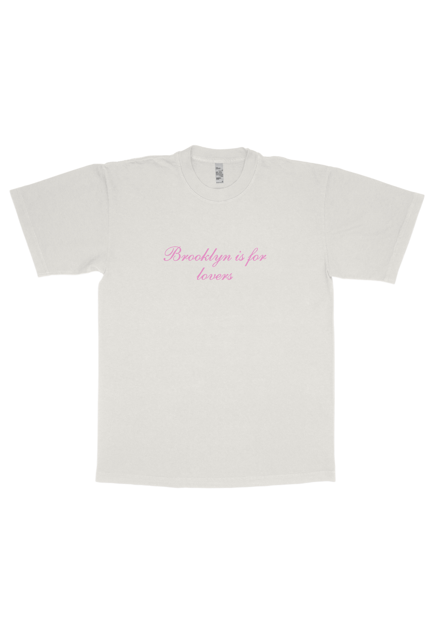 Our favorite borough (don't tell the others). Brooklyn is for lovers, pressed on our classic off white t-shirt, featuring light pink text.
