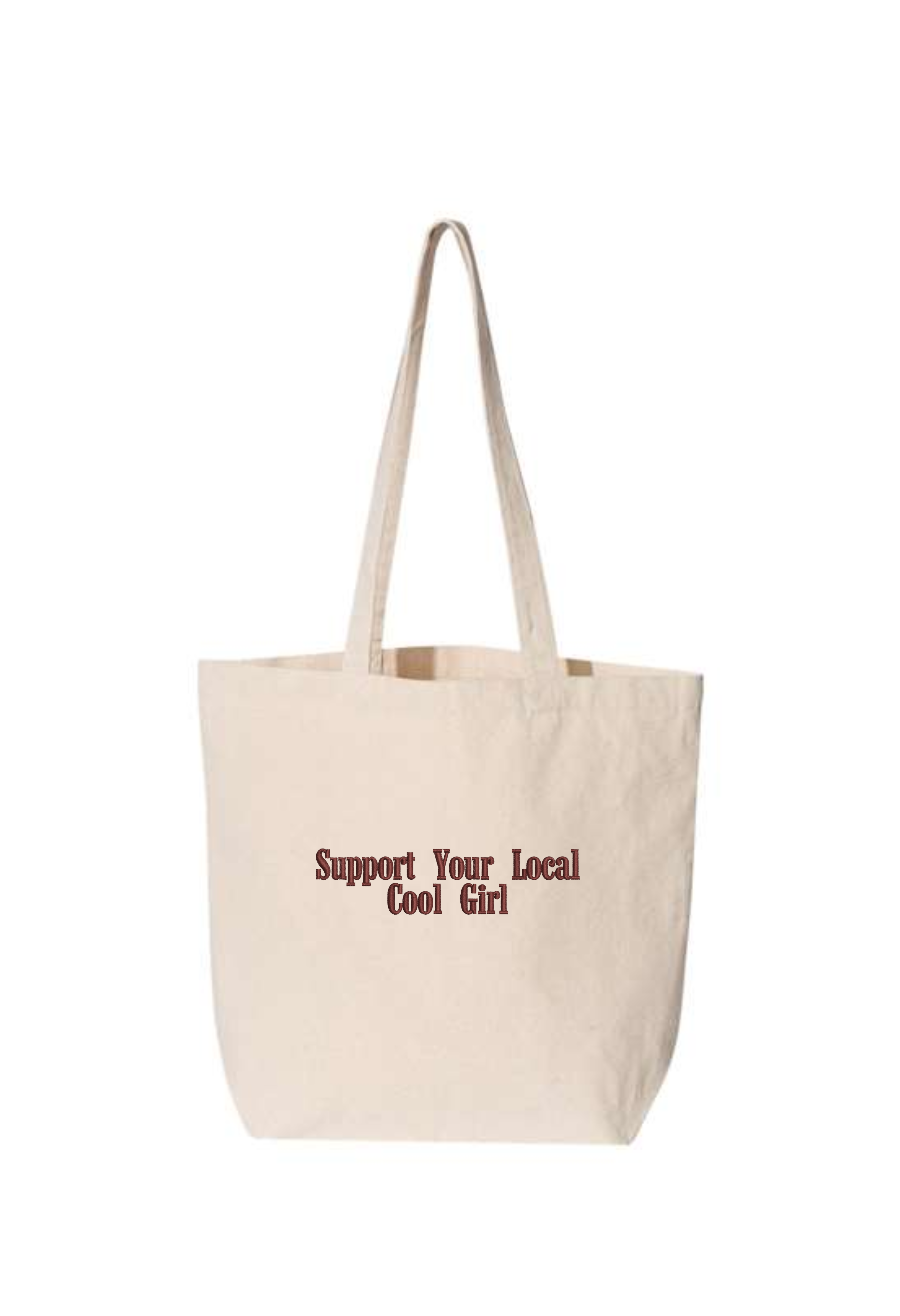 Newest edition in our Cool Girl collection, featuring our classic carry-all wide tote bag embroidered with 'Support Your Local Cool Girl" in brown thread